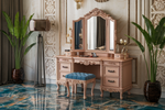 The Ornate Wooden Dressing Table Console combines beauty with practicality. Its spacious tabletop provides plenty of room for grooming essentials, while the large, high-quality mirror enhances usability and creates a sense of openness in your room. Multiple drawers and compartments ensure organized storage for cosmetics, jewelry, and personal items.