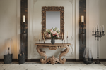 Enhance your decor with the luxury and elegance of this hand-carved teak wood console table. Visit our website to customize and place your order today.